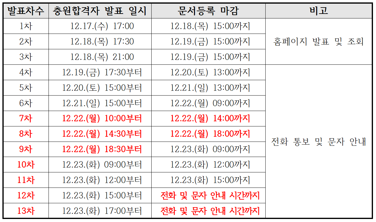 - 4차 이후 충원합격자 발표(전화통보)는 아래 표의 차수를 확인바랍니다.