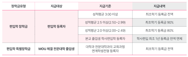 전적대학 성적 평균 3.0이상일 시 최초학기 전액 장학금 지급!