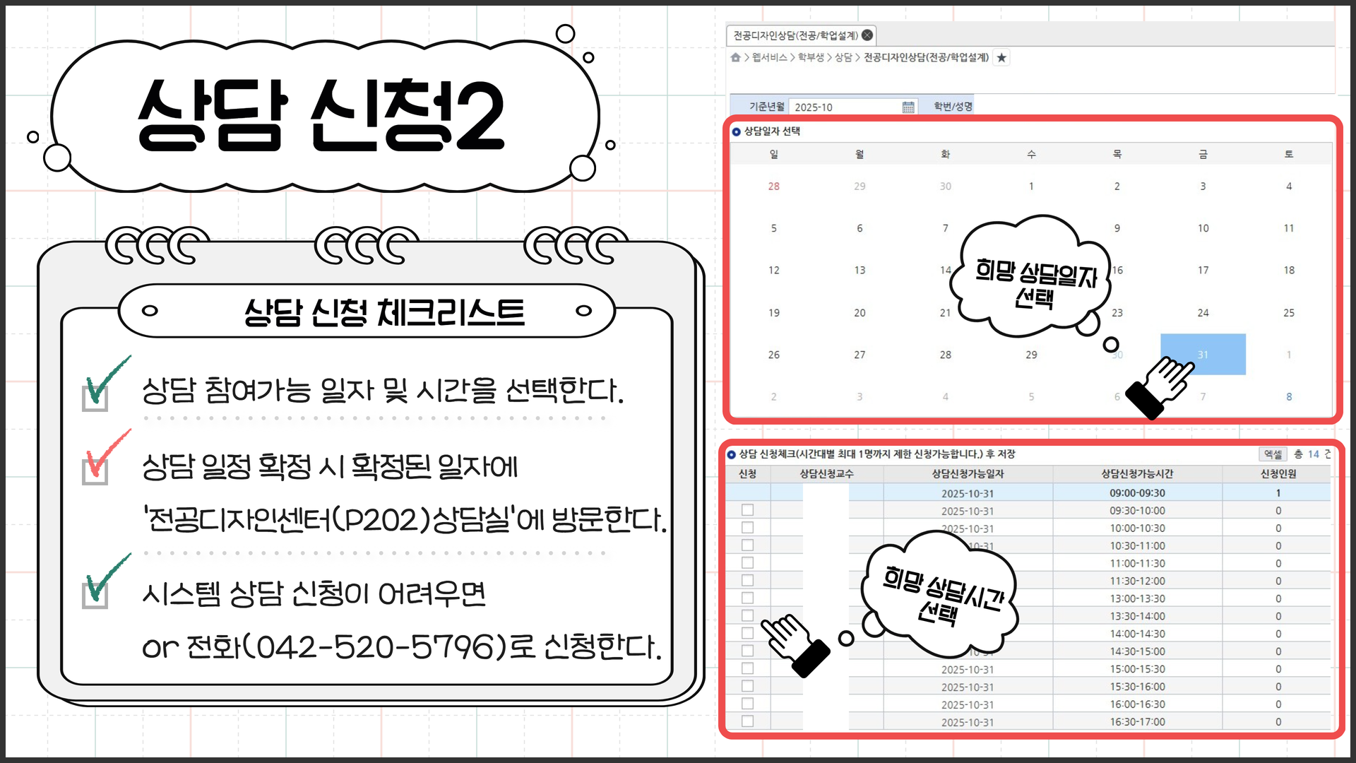 *전공디자인센터 사무실 및 상담실 위치가 변경되었으니(P211, P213 > P202) 변경된 장소로 방문하여 주시기 바랍니다.