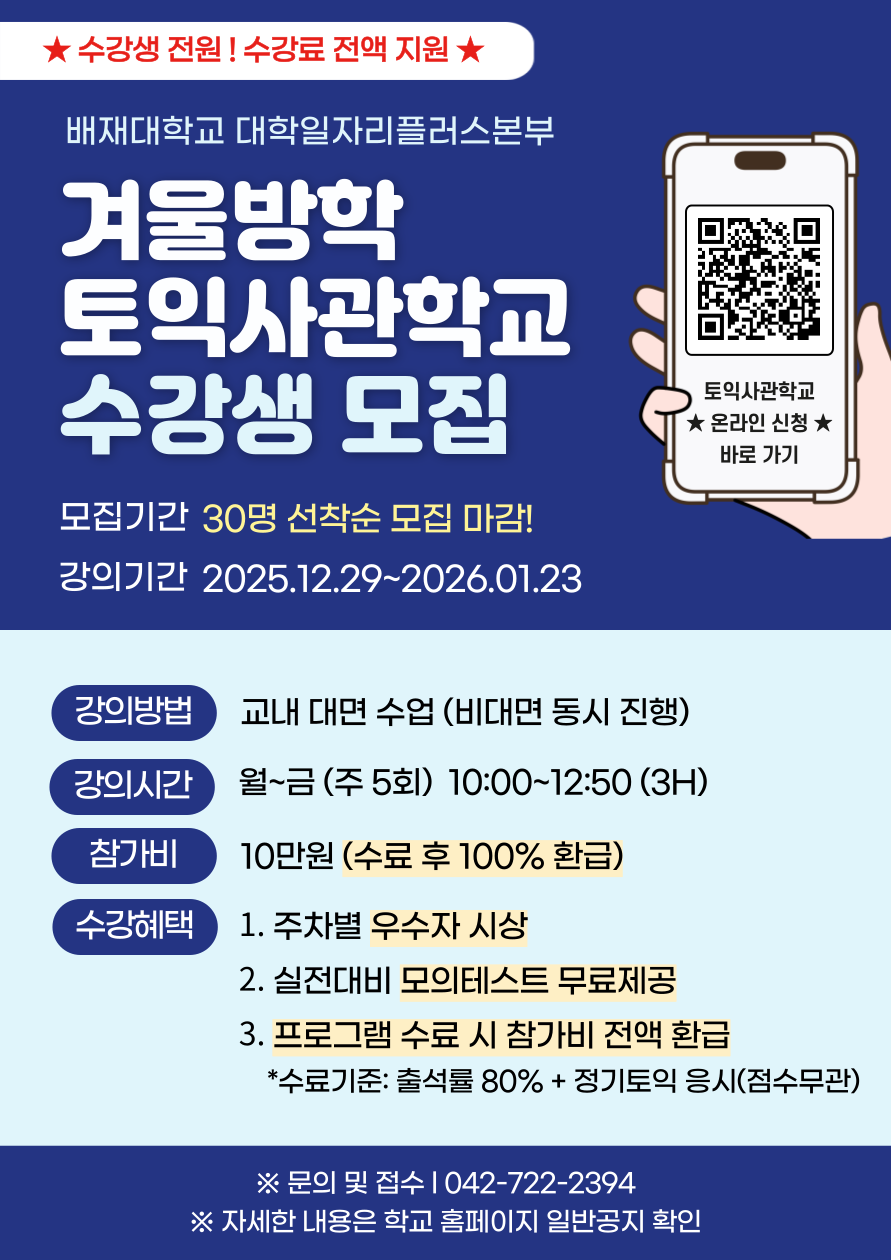 제목[대학일자리플러스본부] 2025학년도 겨울방학 토익사관학교 수강생 모집