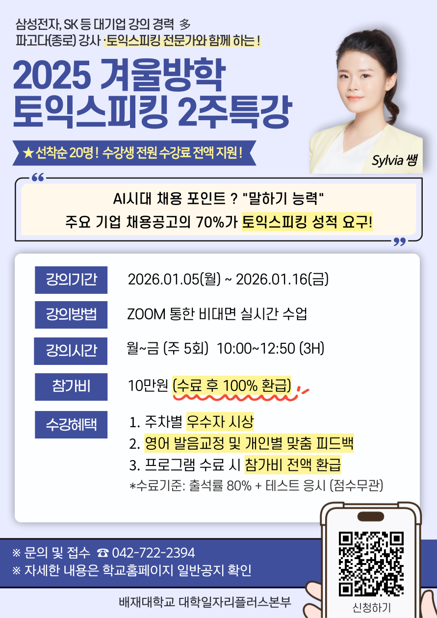 제목[대학일자리플러스본부] 2025학년도 겨울방학 토익스피킹 수강생 모집